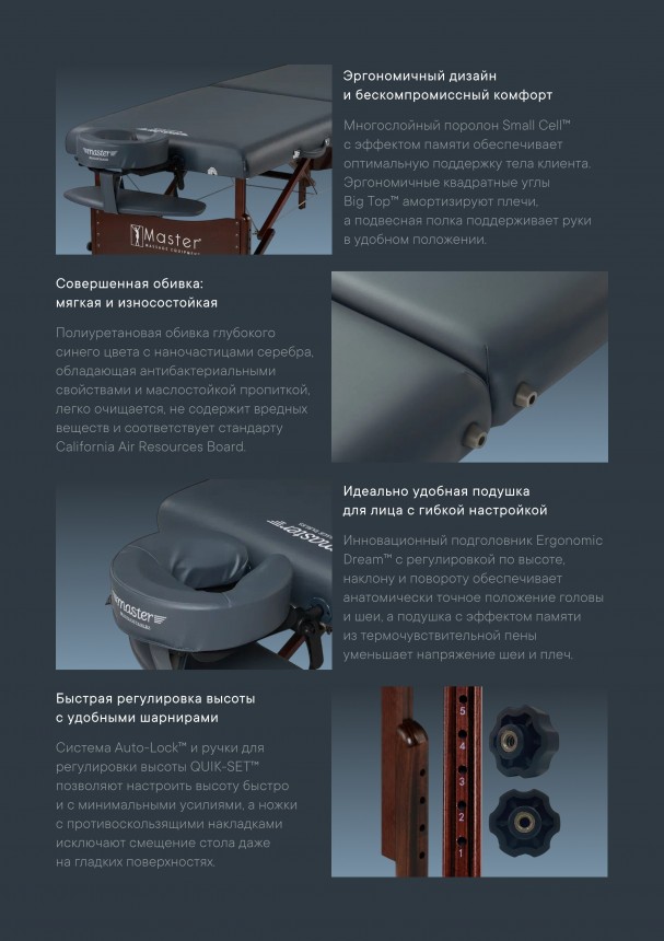 Благодаря конструкции "Big Top" и матрасу толщиной 6,5 см из уникального многослойного пеноматериала Multi-Layer Small Cell™ Foam, стол дарит максимальное удобство. Прямоугольные углы способствуют лучшему расслаблению плечевой зоны. Обивка цвета королевский синий устойчива к маслам и воде, не содержит вредных CFC, что гарантирует долговечность и безопасность этого профессионального оборудования.