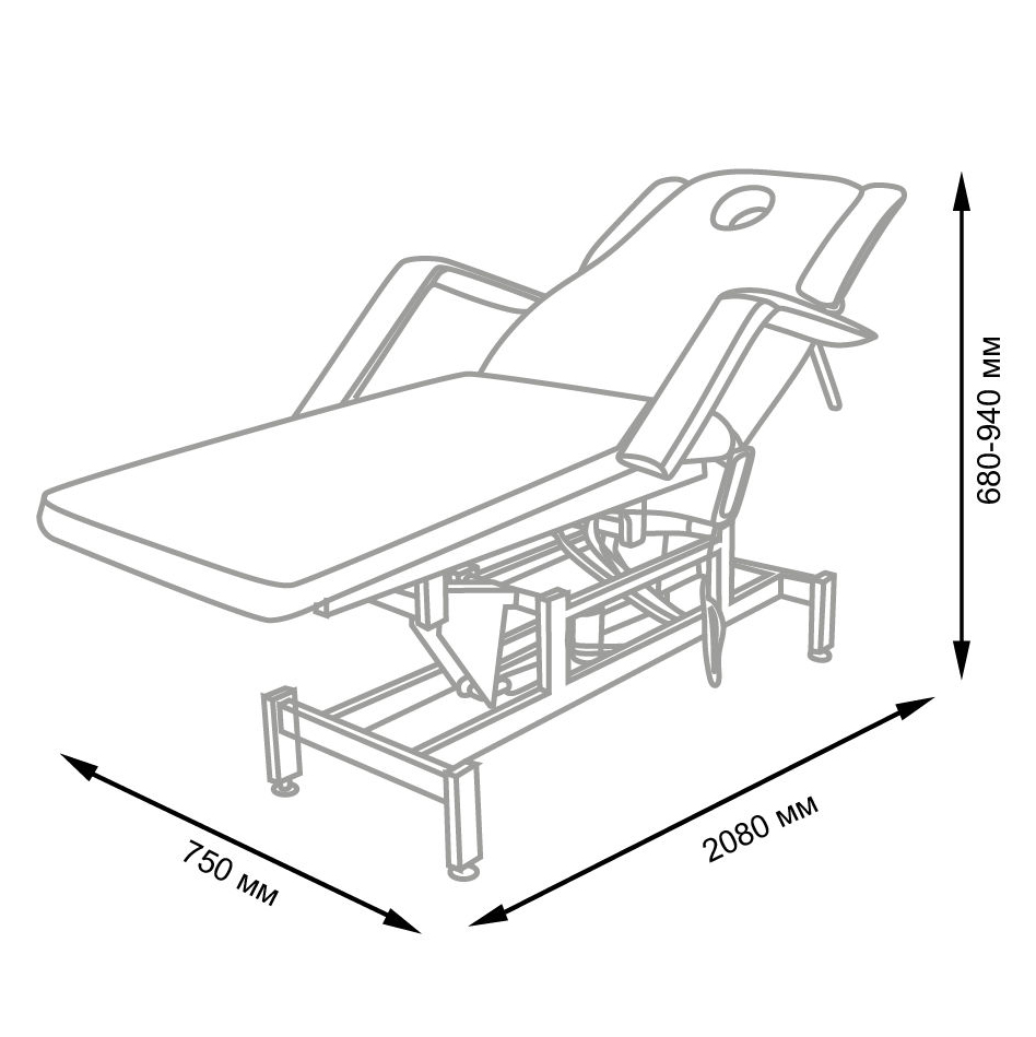 Кушетка разделена на два мягких сегмента, положение которых регулируется. С помощью двух встроенных электромоторов можно дистанционно регулировать угол наклона спинки и высоту кушетки. В комплект поставки входит удобный пульт управления электроприводом. Каркас и основание из металла с защитным покрытием.