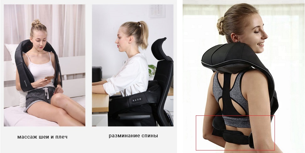 Массажер сделан в виде накидки на плечи и имеет анатомическую форму – повторяет контуры тела.
